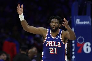 恩比德出场35分钟,19投8中,三分6中3,罚球13中10,拿到29分6篮板2助攻2盖帽,正负值+5。