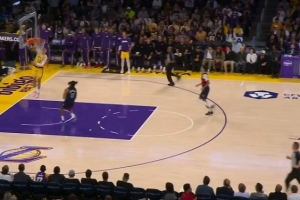 低级失误!海斯长传球被断 华盛顿反击暴扣打停湖人