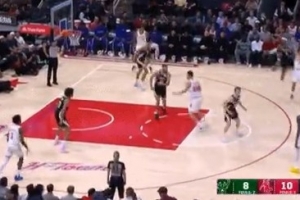 低级失误!海斯长传球被断 华盛顿反击暴扣打停湖人