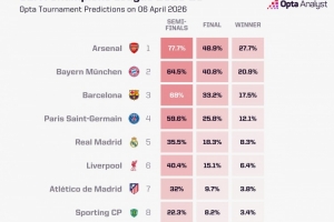 Opta超算预测欧冠(四强-决赛-夺冠)